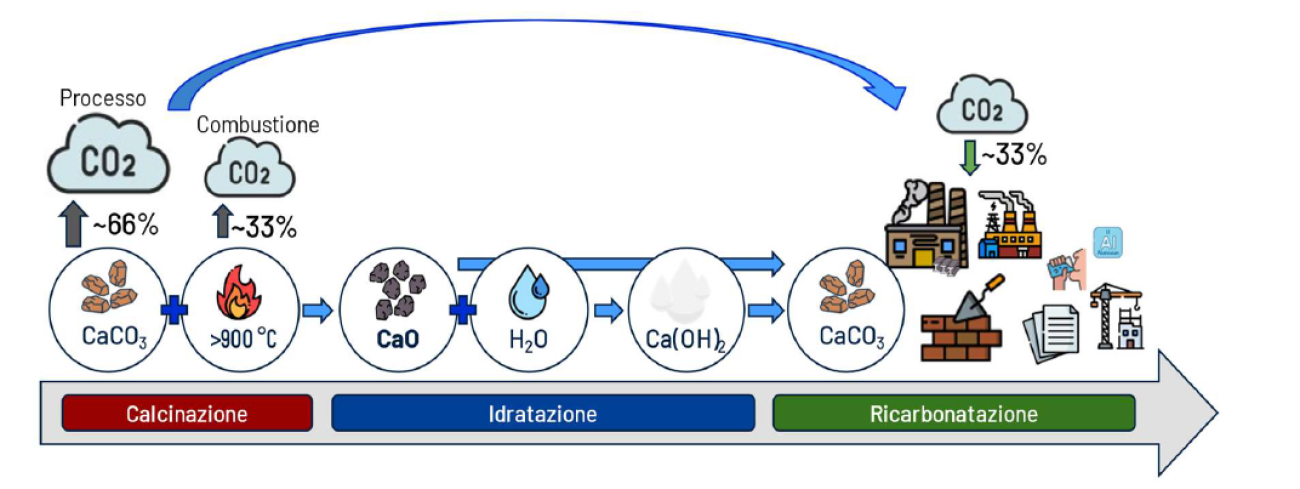 Attualmente, tuttavia, le norme e le politiche sulla contabilità del carbonio tengono in considerazione le emissioni dovute alla produzione della calce, ma non il riassorbimento di CO2 (ossia il fenomeno della ricarbonatazione) che ha luogo durante l’uso dei prodotti a base di calce e le fasi finali del loro ciclo di vita.